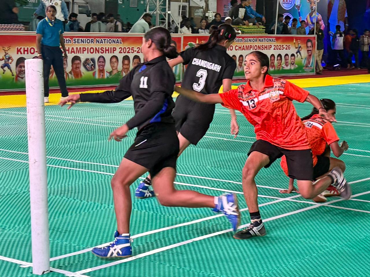 Continuing their impressive run, Maharashtra women defeated Chandigarh by 42–12, winning by 1 inning and 30 points. Shweta Navale (1.50 min, 1.50 min defence), Reshma Rathod (2.20 min defence, 2 points) and Priyanka Ingale (1.50 min defence, 6 points) played key roles. Ritu of Chandigarh (1.00 min defence, 2 points) stood out despite the loss.